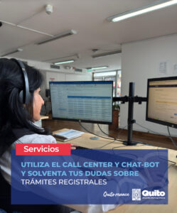 ¿Tienes dudas o consultas sobre tus trámites registrales? Desde cualquier parte del país puedes solventar tus inquietudes a través de los servicios del call center 1800 510 510 opción 4 o en el Chat Bot desde la página web: registrodelapropiedad.quito.gob.ec